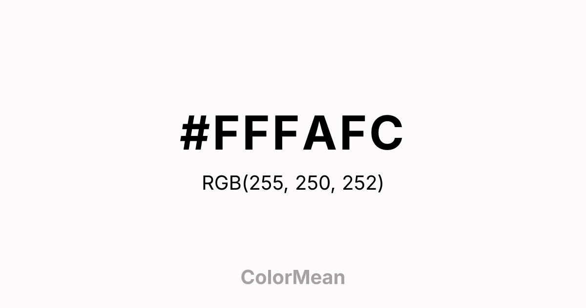 #FFFAFC RGB value is (255, 250, 252). The hex color red value is 255, green is 250, and blue is 252. Its HSL format shows a hue of 336°, saturation of 100 percent, and lightness of 99 percent. The CMYK process values are 0 percent, 2 percent, 1 percent, 0 percent.