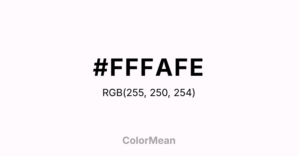 #FFFAFE RGB value is (255, 250, 254). The hex color red value is 255, green is 250, and blue is 254. Its HSL format shows a hue of 312°, saturation of 100 percent, and lightness of 99 percent. The CMYK process values are 0 percent, 2 percent, 0 percent, 0 percent.