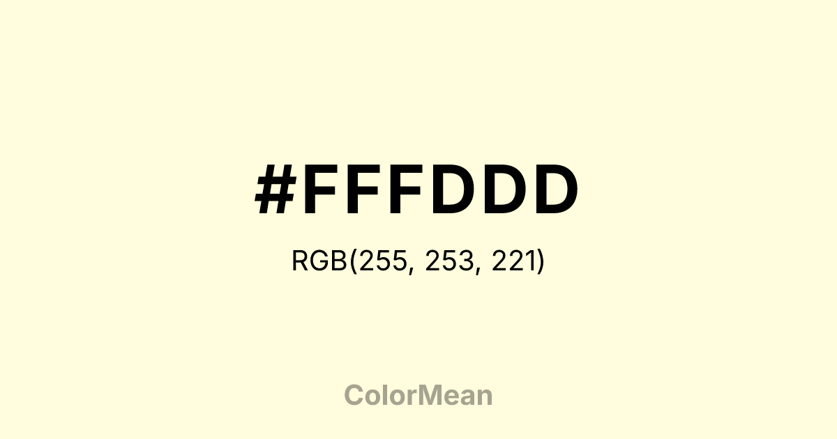 #FFFDDD RGB value is (255, 253, 221). The hex color red value is 255, green is 253, and blue is 221. Its HSL format shows a hue of 56°, saturation of 100 percent, and lightness of 93 percent. The CMYK process values are 0 percent, 1 percent, 13 percent, 0 percent.