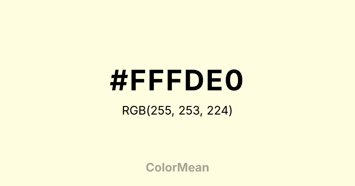 #FFFDE0 RGB value is (255, 253, 224). The hex color red value is 255, green is 253, and blue is 224. Its HSL format shows a hue of 56°, saturation of 100 percent, and lightness of 94 percent. The CMYK process values are 0 percent, 1 percent, 12 percent, 0 percent.