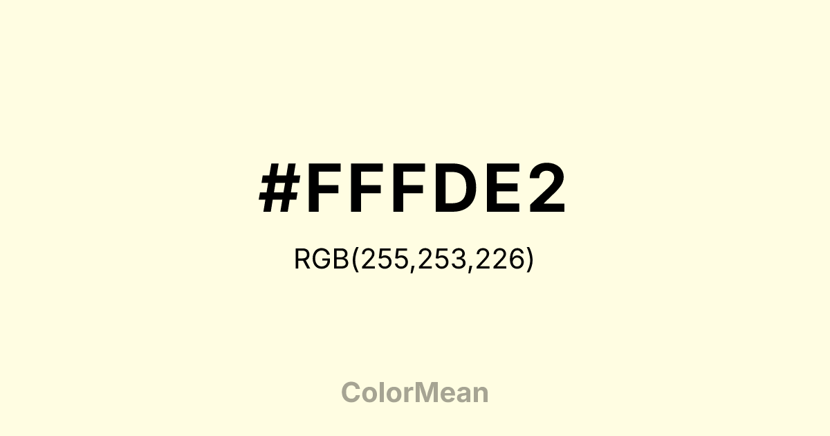 #FFFDE2 RGB value is (255, 253, 226). The hex color red value is 255, green is 253, and blue is 226. Its HSL format shows a hue of 56°, saturation of 100 percent, and lightness of 94 percent. The CMYK process values are 0 percent, 1 percent, 11 percent, 0 percent.