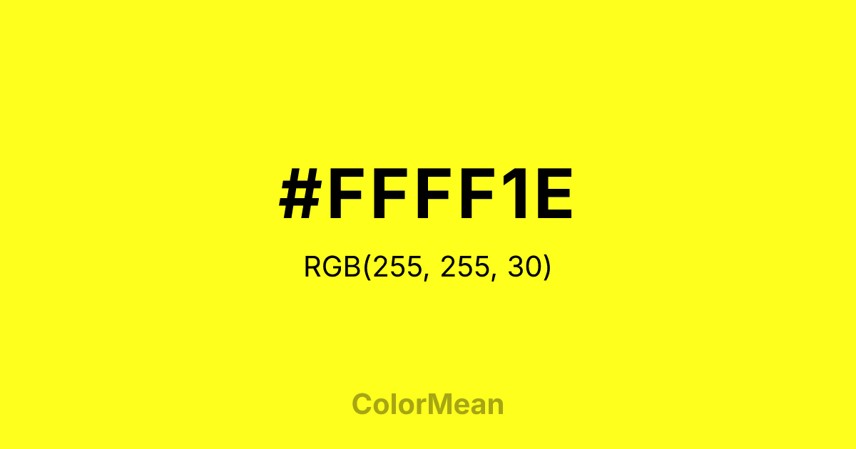 #FFFF1E RGB value is (255, 255, 30). The hex color red value is 255, green is 255, and blue is 30. Its HSL format shows a hue of 60°, saturation of 100 percent, and lightness of 56 percent. The CMYK process values are 0 percent, 0 percent, 88 percent, 0 percent.