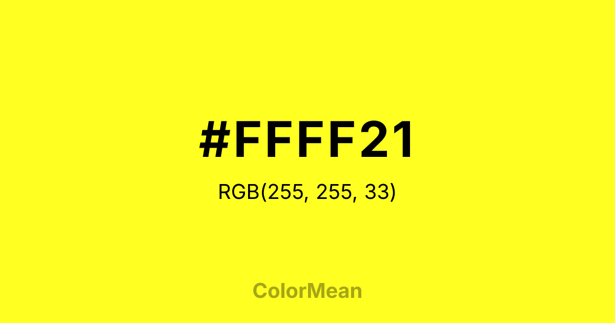 #FFFF21 RGB value is (255, 255, 33). The hex color red value is 255, green is 255, and blue is 33. Its HSL format shows a hue of 60°, saturation of 100 percent, and lightness of 56 percent. The CMYK process values are 0 percent, 0 percent, 87 percent, 0 percent.