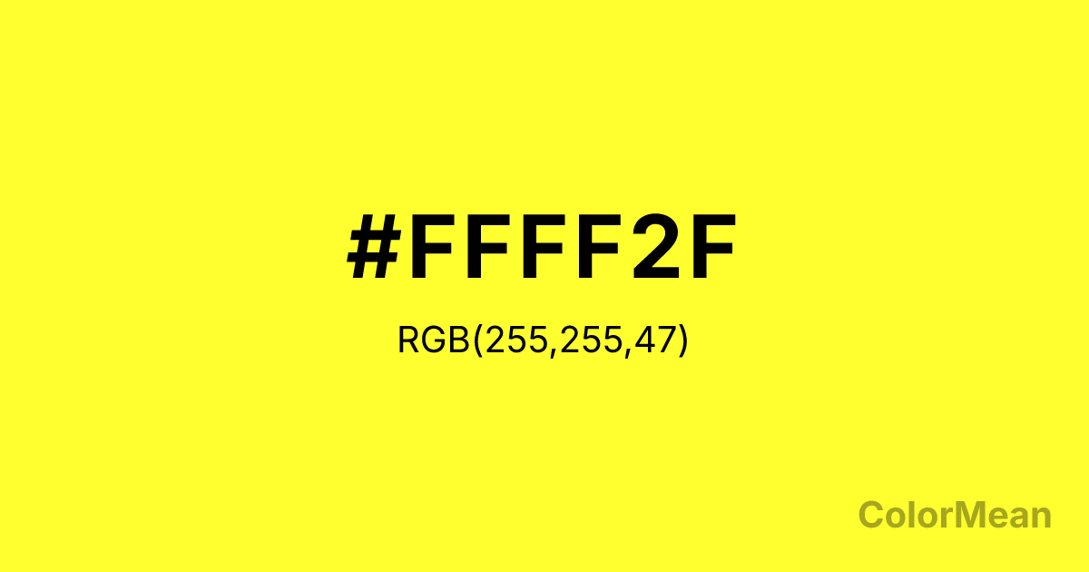 #FFFF2F RGB value is (255, 255, 47). The hex color red value is 255, green is 255, and blue is 47. Its HSL format shows a hue of 60°, saturation of 100 percent, and lightness of 59 percent. The CMYK process values are 0 percent, 0 percent, 82 percent, 0 percent.
