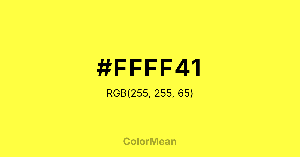 #FFFF41 RGB value is (255, 255, 65). The hex color red value is 255, green is 255, and blue is 65. Its HSL format shows a hue of 60°, saturation of 100 percent, and lightness of 63 percent. The CMYK process values are 0 percent, 0 percent, 75 percent, 0 percent.