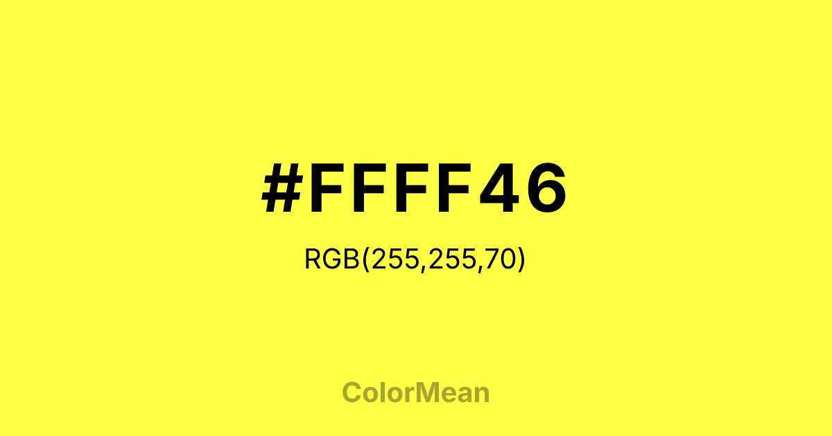 #FFFF46 RGB value is (255, 255, 70). The hex color red value is 255, green is 255, and blue is 70. Its HSL format shows a hue of 60°, saturation of 100 percent, and lightness of 64 percent. The CMYK process values are 0 percent, 0 percent, 73 percent, 0 percent.