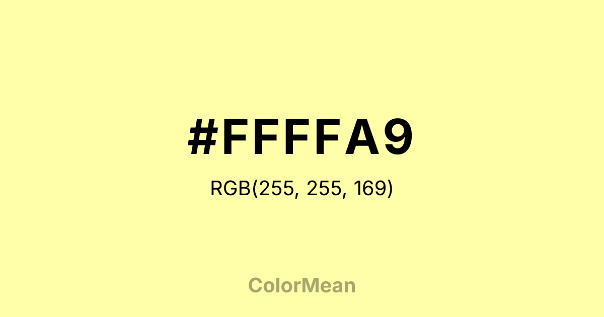 #FFFFA9 RGB value is (255, 255, 169). The hex color red value is 255, green is 255, and blue is 169. Its HSL format shows a hue of 60°, saturation of 100 percent, and lightness of 83 percent. The CMYK process values are 0 percent, 0 percent, 34 percent, 0 percent.