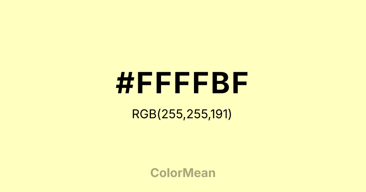 Very Pale Yellow (#FFFFBF) RGB value is (255, 255, 191). The hex color red value is 255, green is 255, and blue is 191. Its HSL format shows a hue of 60°, saturation of 100 percent, and lightness of87 percent. The CMYK process values are 0 percent, 0 percent, 25 percent, 0percent.