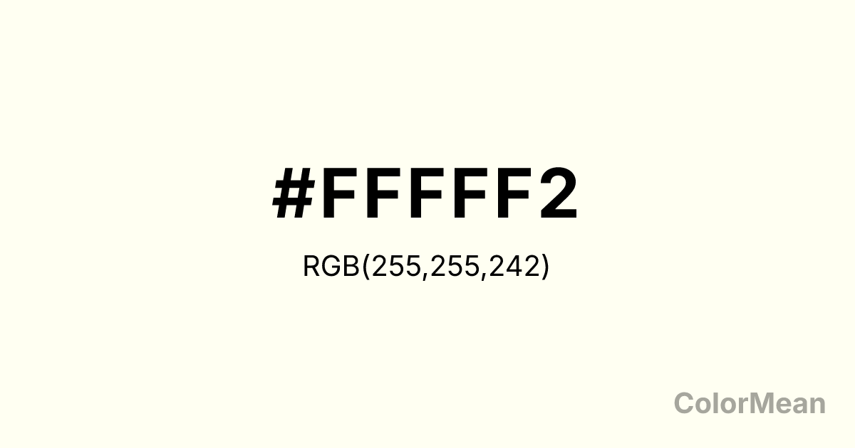 #FFFFF2 RGB value is (255, 255, 242). The hex color red value is 255, green is 255, and blue is 242. Its HSL format shows a hue of 60°, saturation of 100 percent, and lightness of 97 percent. The CMYK process values are 0 percent, 0 percent, 5 percent, 0 percent.