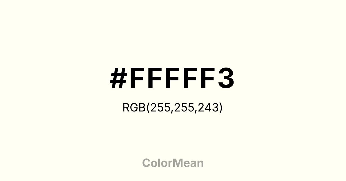 #FFFFF3 RGB value is (255, 255, 243). The hex color red value is 255, green is 255, and blue is 243. Its HSL format shows a hue of 60°, saturation of 100 percent, and lightness of 98 percent. The CMYK process values are 0 percent, 0 percent, 5 percent, 0 percent.