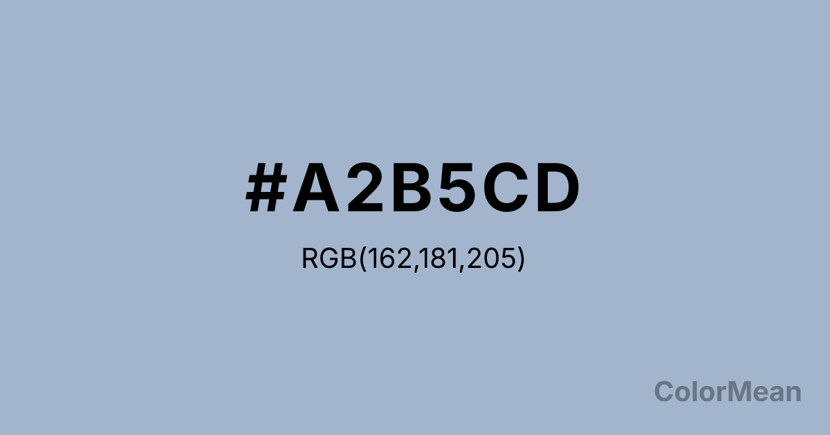 LightSteelBlue3 (#A2B5CD) RGB value is (162, 181, 205). The hex color red value is 162, green is 181, and blue is 205. Its HSL format shows a hue of 213°, saturation of 30 percent, and lightness of 72 percent. The CMYK process values are 21 percent, 12 percent, 0 percent, 20 percent.