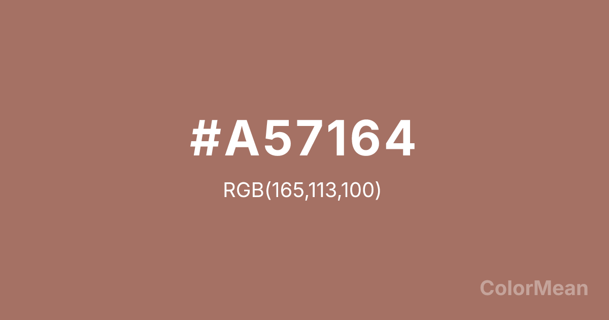 Blast-off Bronze (#A57164) RGB value is (165, 113, 100). The hex color red value is 165, green is 113, and blue is 100. Its HSL format shows a hue of 12°, saturation of 27 percent, and lightness of 52 percent. The CMYK process values are 0 percent, 32 percent, 39 percent, 35 percent.