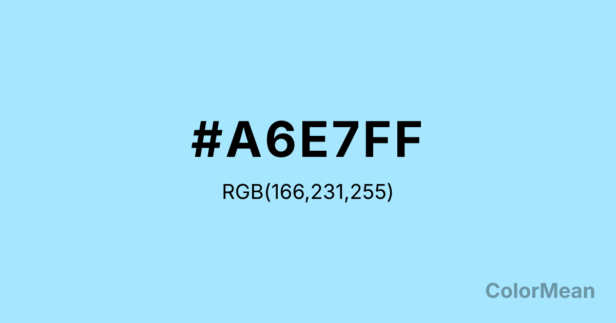 Fresh Air (#A6E7FF) RGB value is (166, 231, 255). The hex color red value is 166, green is 231, and blue is 255. Its HSL format shows a hue of 196°, saturation of 100 percent, and lightness of 83 percent. The CMYK process values are 35 percent, 9 percent, 0 percent, 0 percent.