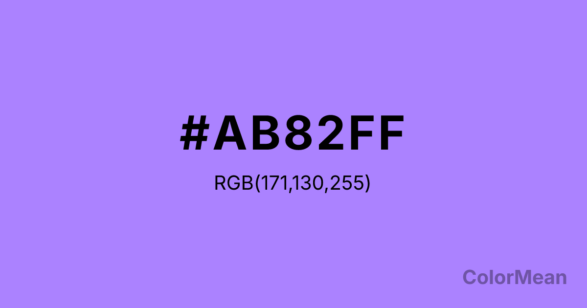 MediumPurple1 (#AB82FF) RGB value is (171, 130, 255). The hex color red value is 171, green is 130, and blue is 255. Its HSL format shows a hue of 260°, saturation of 100 percent, and lightness of 75 percent. The CMYK process values are 33 percent, 49 percent, 0 percent, 0 percent.