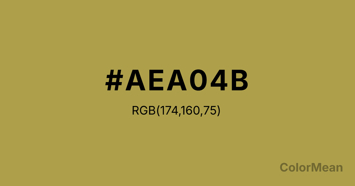 Ochre Yellow (#AEA04B) RGB value is (174, 160, 75). The hex color red value is 174, green is 160, and blue is 75. Its HSL format shows a hue of 52°, saturation of 40 percent, and lightness of 49 percent. The CMYK process values are 0 percent, 8 percent, 57 percent, 32 percent.