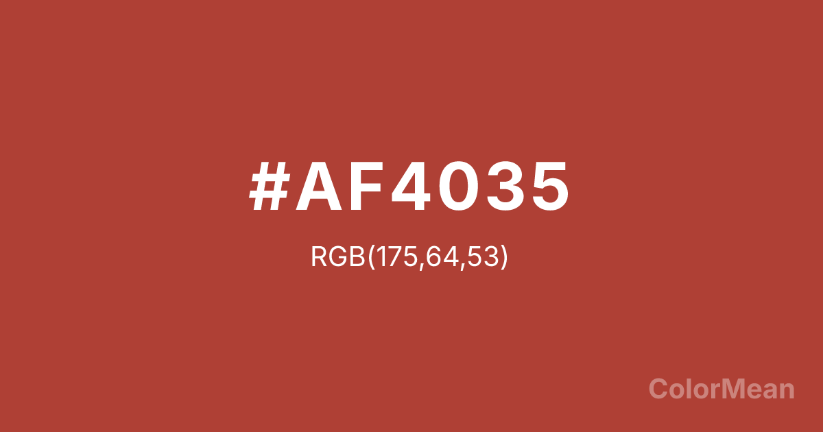 Pale Carmine (#AF4035) RGB value is (175, 64, 53). The hex color red value is 175, green is 64, and blue is 53. Its HSL format shows a hue of 5°, saturation of 54 percent, and lightness of 45 percent. The CMYK process values are 0 percent, 63 percent, 70 percent, 31 percent.