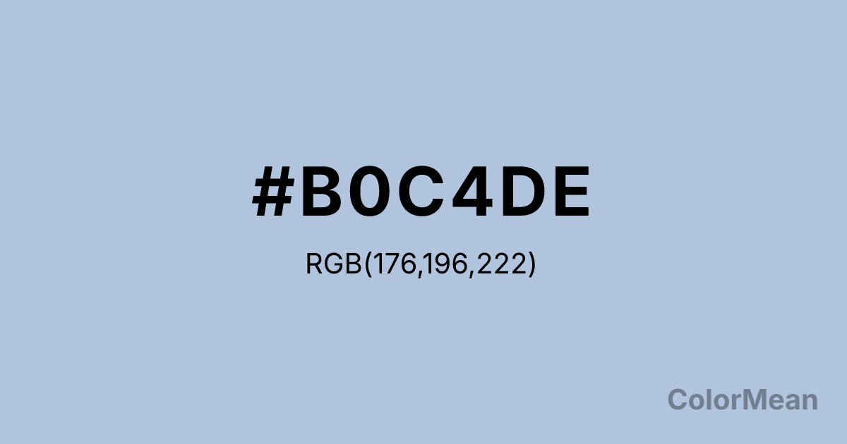 LightsteelBlue (#B0C4DE) RGB value is (176, 196, 222). The hex color red value is 176, green is 196, and blue is 222. Its HSL format shows a hue of 214°, saturation of 41 percent, and lightness of 78 percent. The CMYK process values are 21 percent, 12 percent, 0 percent, 13 percent.