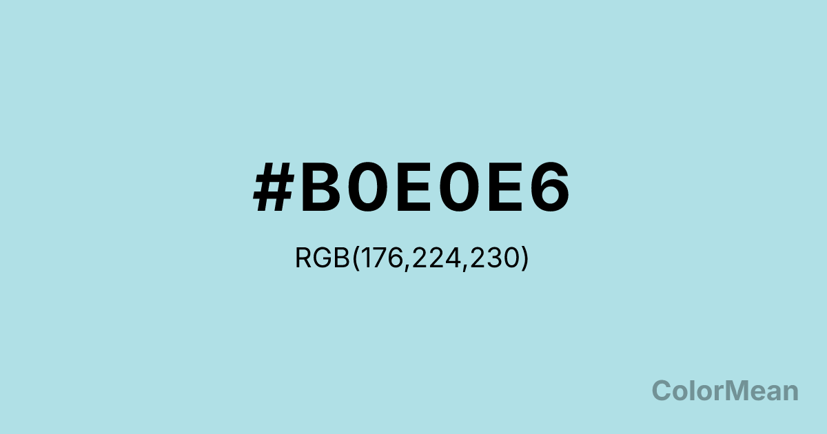 Powder Blue (#B0E0E6) RGB value is (176, 224, 230). The hex color red value is 176, green is 224, and blue is 230. Its HSL format shows a hue of 187°, saturation of 52 percent, and lightness of 80 percent. The CMYK process values are 23 percent, 3 percent, 0 percent, 10 percent.