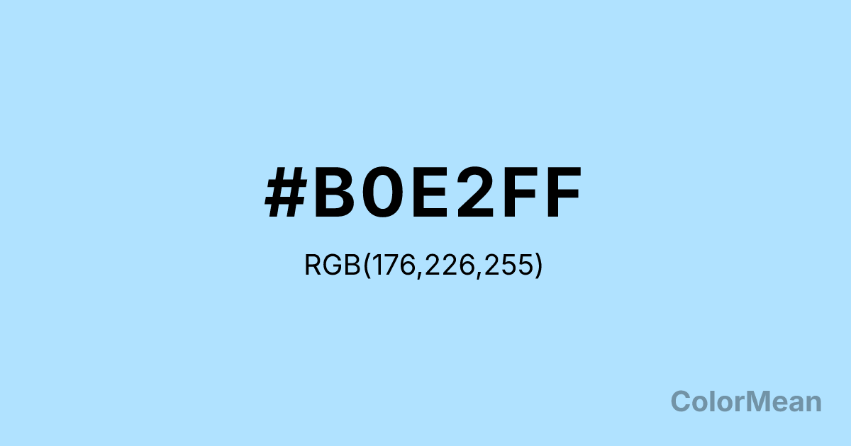 LightSkyBlue1 (#B0E2FF) RGB value is (176, 226, 255). The hex color red value is 176, green is 226, and blue is 255. Its HSL format shows a hue of 202°, saturation of 100 percent, and lightness of 85 percent. The CMYK process values are 31 percent, 11 percent, 0 percent, 0 percent.