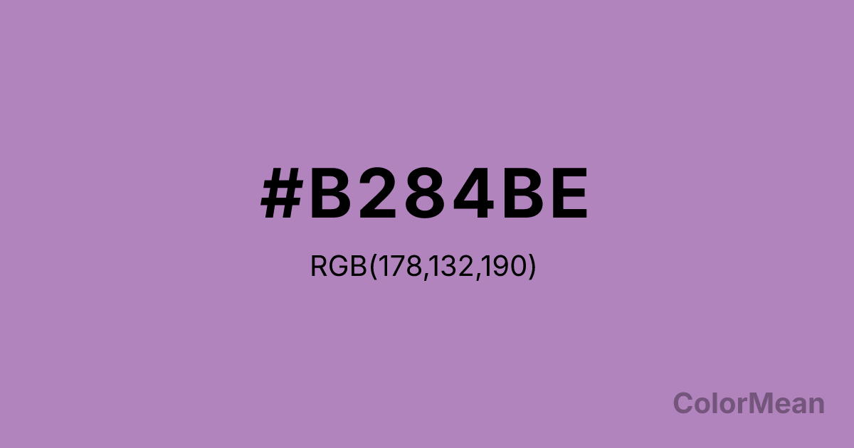 African Violet (#B284BE) RGB value is (178, 132, 190). The hex color red value is 178, green is 132, and blue is 190. Its HSL format shows a hue of 288°, saturation of 31 percent, and lightness of 63 percent. The CMYK process values are 6 percent, 31 percent, 0 percent, 25 percent.