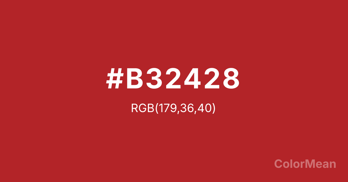 Orient Red (#B32428) RGB value is (179, 36, 40). The hex color red value is 179, green is 36, and blue is 40. Its HSL format shows a hue of 358°, saturation of 67 percent, and lightness of 42 percent. The CMYK process values are 0 percent, 80 percent, 78 percent, 30 percent.