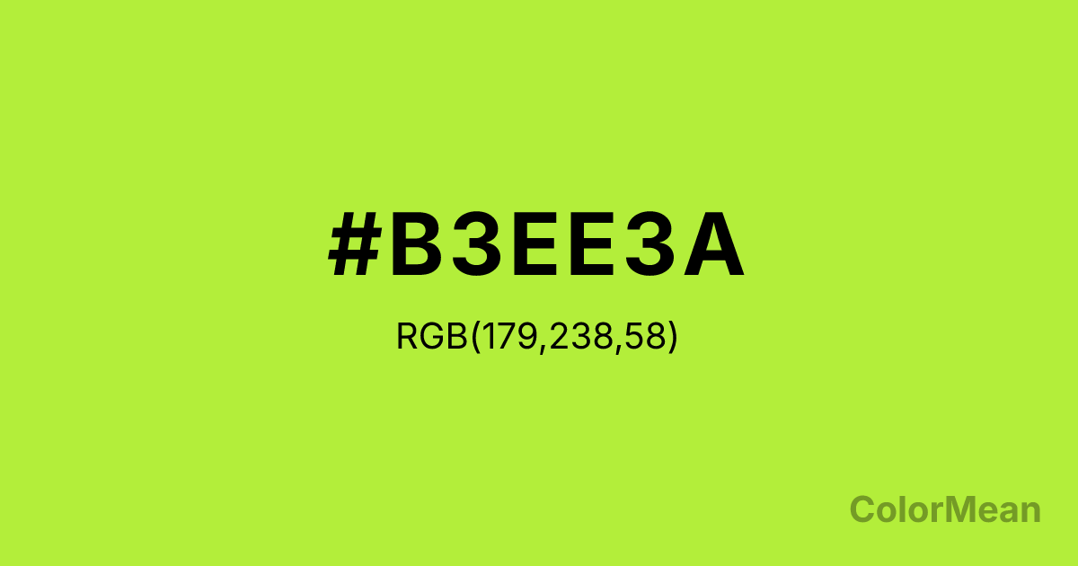 OliveDrab2 (#B3EE3A) RGB value is (179, 238, 58). The hex color red value is 179, green is 238, and blue is 58. Its HSL format shows a hue of 80°, saturation of 84 percent, and lightness of 58 percent. The CMYK process values are 25 percent, 0 percent, 76 percent, 7 percent.