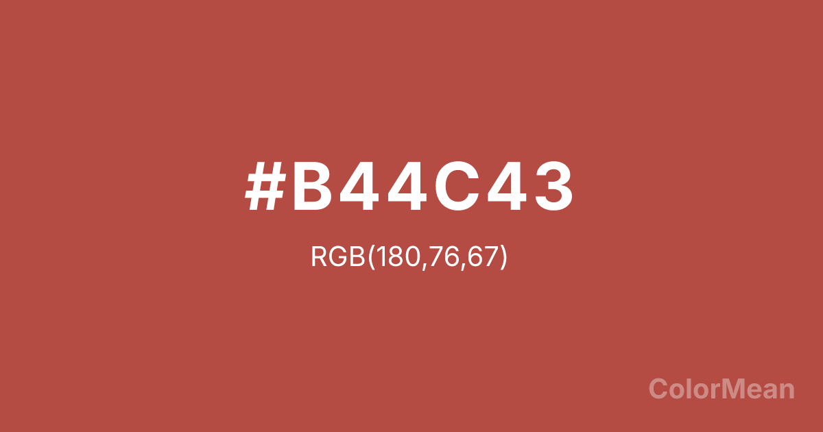 Convert Pearl Pink (#B44C43) across different color models and formats. These conversions help designers work seamlessly between digital and print media, ensuring this color maintains its intended appearance across RGB screens, CMYK printers, and HSL color manipulations.