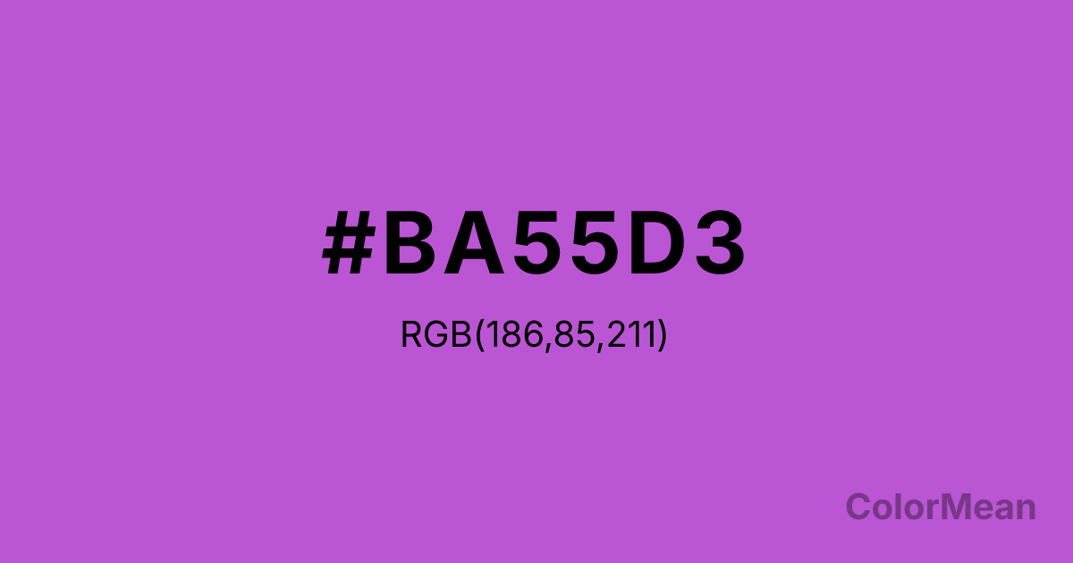 MediumOrchid (#BA55D3) RGB value is (186, 85, 211). The hex color red value is 186, green is 85, and blue is 211. Its HSL format shows a hue of 288°, saturation of 59 percent, and lightness of 58 percent. The CMYK process values are 12 percent, 60 percent, 0 percent, 17 percent.
