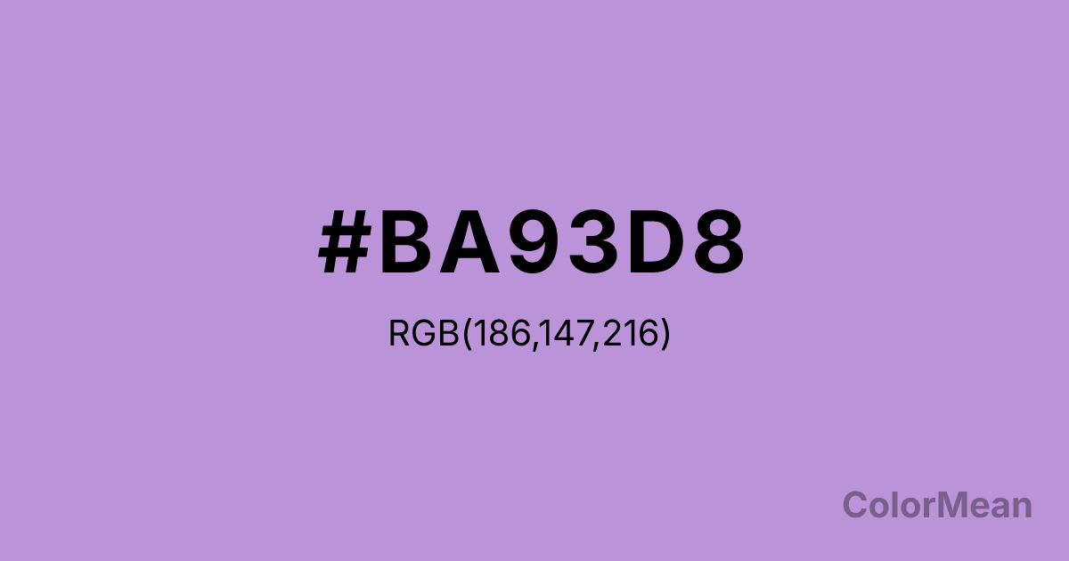 Lenurple (#BA93D8) RGB value is (186, 147, 216). The hex color red value is 186, green is 147, and blue is 216. Its HSL format shows a hue of 274°, saturation of 47 percent, and lightness of 71 percent. The CMYK process values are 14 percent, 32 percent, 0 percent, 15 percent.