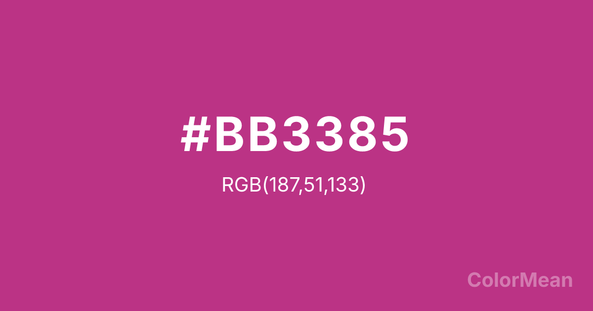 Medium Red Violet (#BB3385) RGB value is (187, 51, 133). The hex color red value is 187, green is 51, and blue is 133. Its HSL format shows a hue of 324°, saturation of 57 percent, and lightness of 47 percent. The CMYK process values are 0 percent, 73 percent, 29 percent, 27 percent.