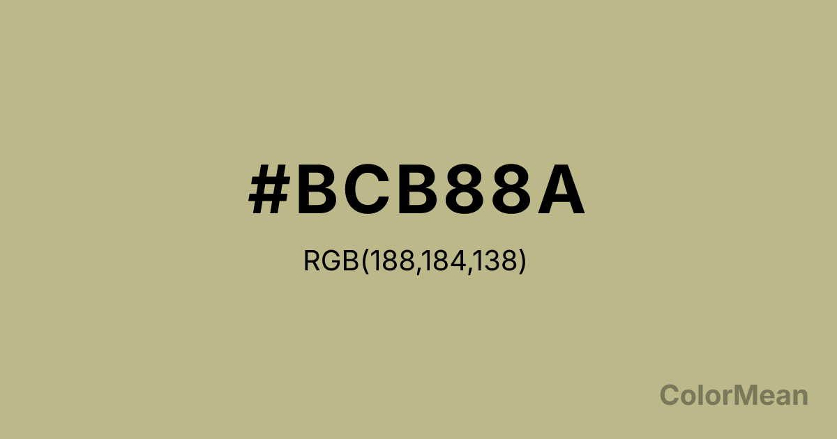 Sage (#BCB88A) RGB value is (188, 184, 138). The hex color red value is 188, green is 184, and blue is 138. Its HSL format shows a hue of 55°, saturation of 27 percent, and lightness of 64 percent. The CMYK process values are 0 percent, 2 percent, 27 percent, 26 percent.