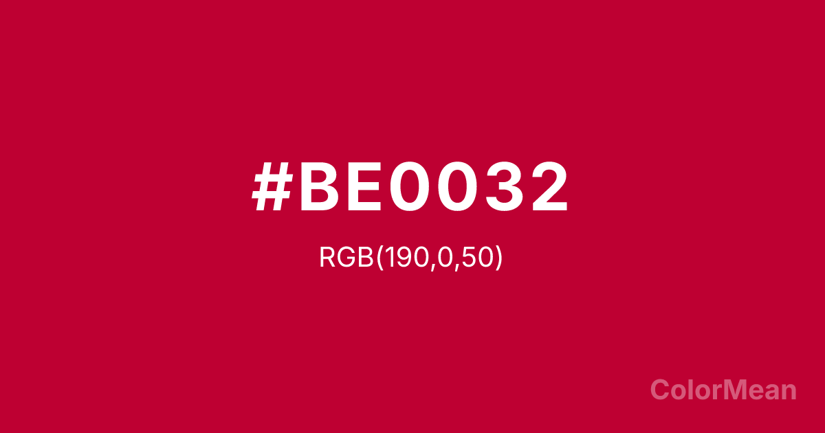 Crimson Glory (#BE0032) RGB value is (190, 0, 50). The hex color red value is 190, green is 0, and blue is 50. Its HSL format shows a hue of 344°, saturation of 100 percent, and lightness of 37 percent. The CMYK process values are 0 percent, 100 percent, 74 percent, 25 percent.