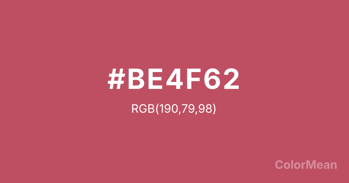 Popstar (#BE4F62) RGB value is (190, 79, 98). The hex color red value is 190, green is 79, and blue is 98. Its HSL format shows a hue of 350°, saturation of 46 percent, and lightness of 53 percent. The CMYK process values are 0 percent, 58 percent, 48 percent, 25 percent.