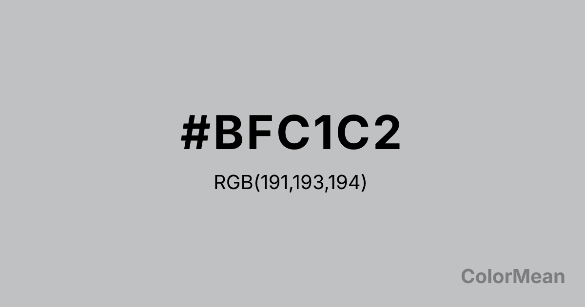 Silver Sand (#BFC1C2) RGB value is (191, 193, 194). The hex color red value is 191, green is 193, and blue is 194. Its HSL format shows a hue of 200°, saturation of 2 percent, and lightness of 75 percent. The CMYK process values are 2 percent, 1 percent, 0 percent, 24 percent.