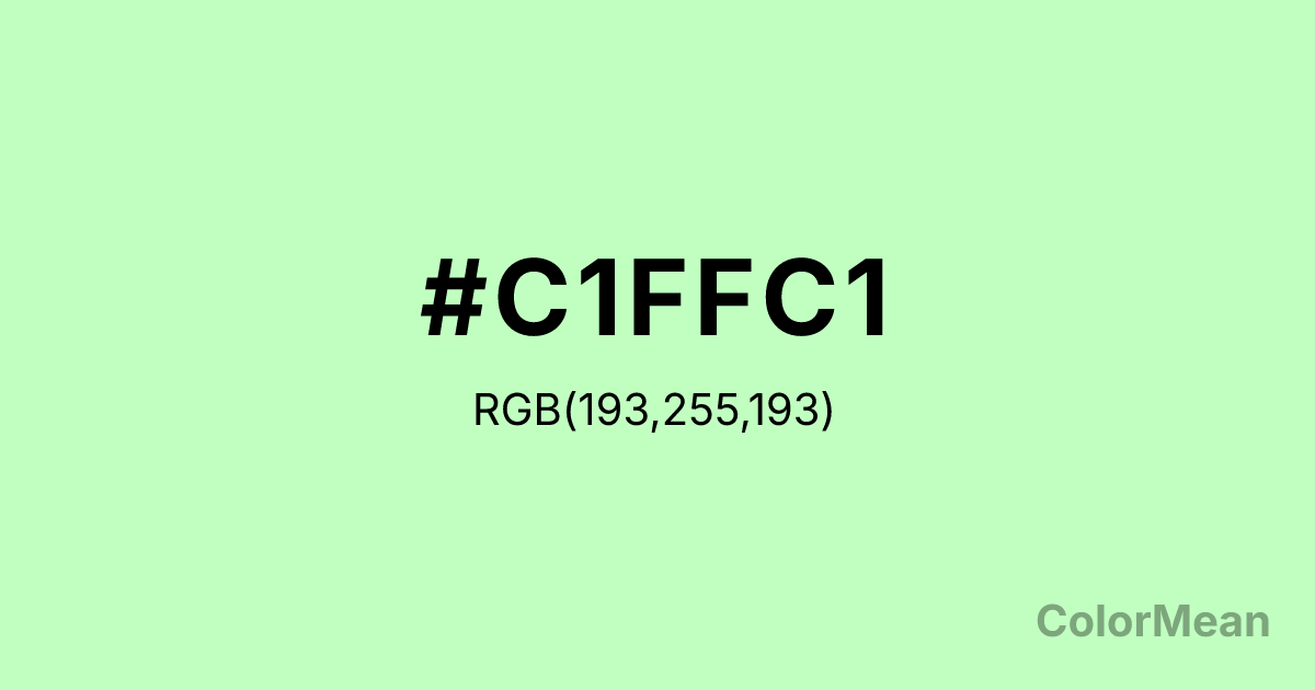 DarkSeaGreen1 (#C1FFC1) RGB value is (193, 255, 193). The hex color red value is 193, green is 255, and blue is 193. Its HSL format shows a hue of 120°, saturation of 100 percent, and lightness of 88 percent. The CMYK process values are 24 percent, 0 percent, 24 percent, 0 percent.