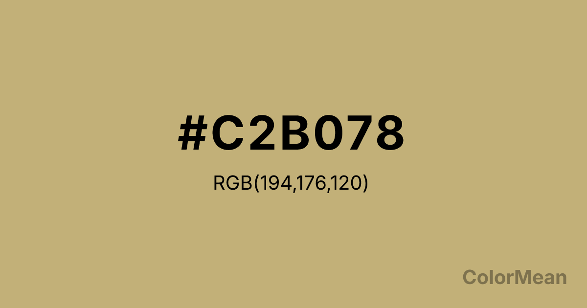 Beige (#C2B078) RGB value is (194, 176, 120). The hex color red value is 194, green is 176, and blue is 120. Its HSL format shows a hue of 45°, saturation of 38 percent, and lightness of 62 percent. The CMYK process values are 0 percent, 9 percent, 38 percent, 24 percent.