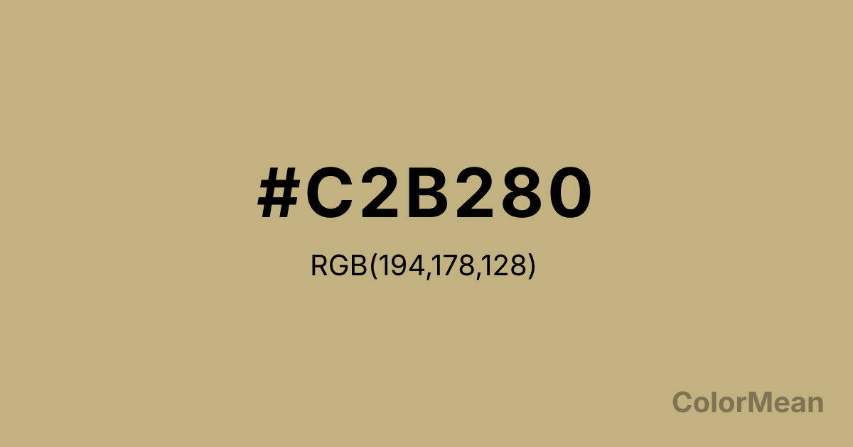 Sand (#C2B280) RGB value is (194, 178, 128). The hex color red value is 194, green is 178, and blue is 128. Its HSL format shows a hue of 45°, saturation of 35 percent, and lightness of 63 percent. The CMYK process values are 0 percent, 8 percent, 34 percent, 24 percent.