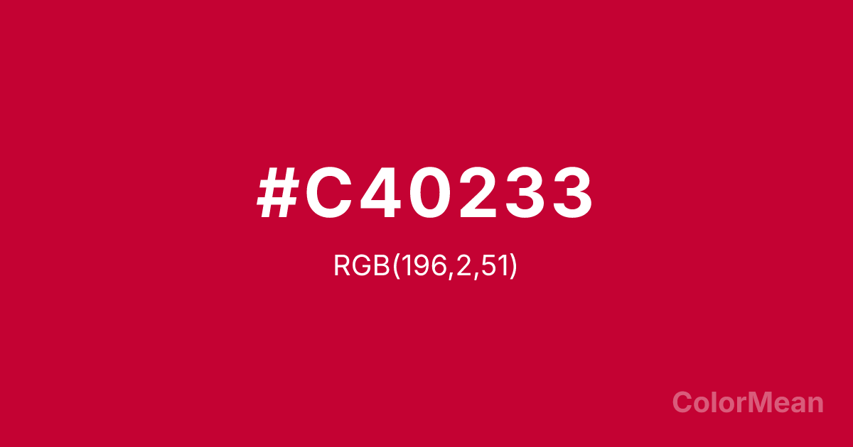 Red (NCS) (#C40233) RGB value is (196, 2, 51). The hex color red value is 196, green is 2, and blue is 51. Its HSL format shows a hue of 345°, saturation of 98 percent, and lightness of 39 percent. The CMYK process values are 0 percent, 99 percent, 74 percent, 23 percent.