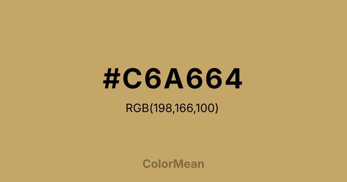 Sand Yellow (#C6A664) RGB value is (198, 166, 100). The hex color red value is 198, green is 166, and blue is 100. Its HSL format shows a hue of 40°, saturation of 46 percent, and lightness of 58 percent. The CMYK process values are 0 percent, 16 percent, 49 percent, 22 percent.