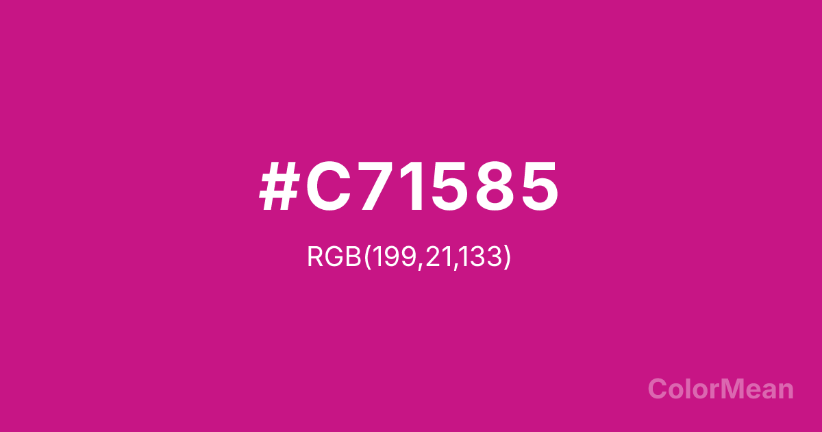 Red-Violet (#C71585) RGB value is (199, 21, 133). The hex color red value is 199, green is 21, and blue is 133. Its HSL format shows a hue of 322°, saturation of 81 percent, and lightness of 43 percent. The CMYK process values are 0 percent, 89 percent, 33 percent, 22 percent.