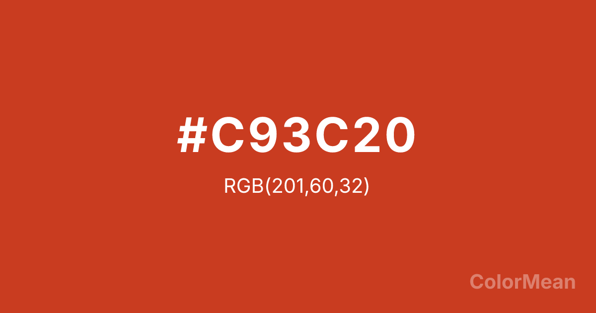 Red Orange (#C93C20) RGB value is (201, 60, 32). The hex color red value is 201, green is 60, and blue is 32. Its HSL format shows a hue of 10°, saturation of 73 percent, and lightness of 46 percent. The CMYK process values are 0 percent, 70 percent, 84 percent, 21 percent.