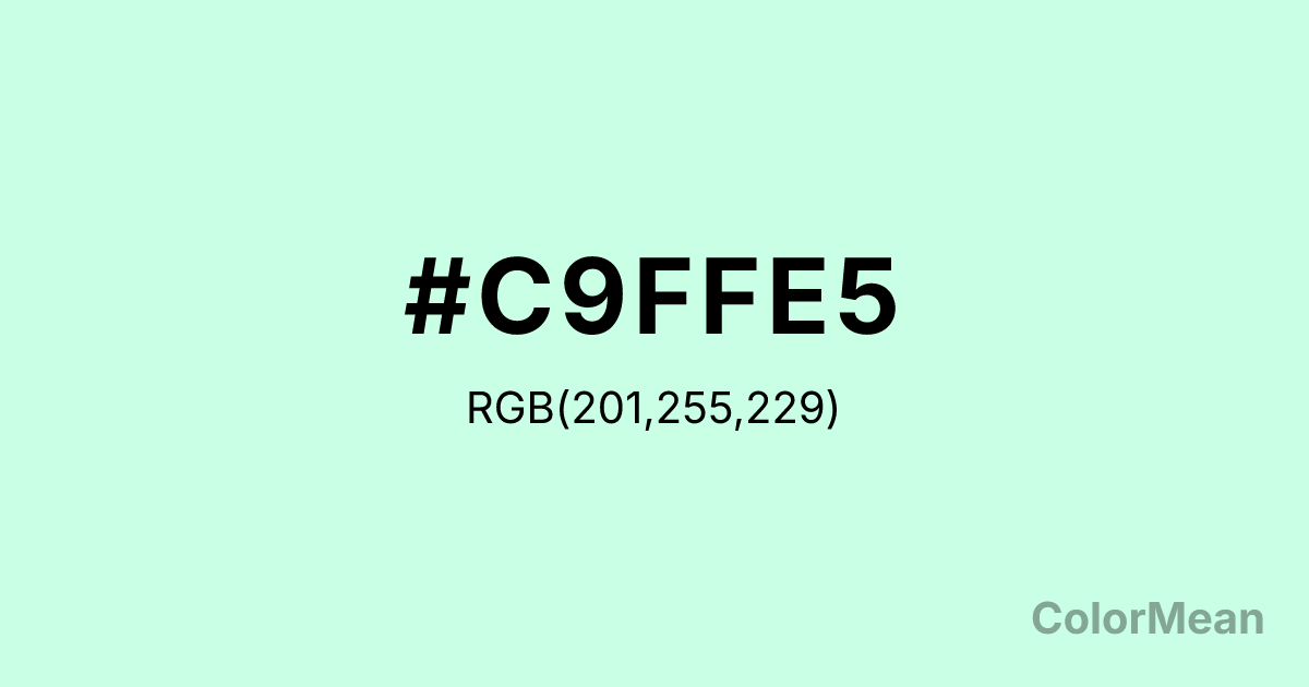 Aero Blue (#C9FFE5) RGB value is (201, 255, 229). The hex color red value is 201, green is 255, and blue is 229. Its HSL format shows a hue of 151°, saturation of 100 percent, and lightness of 89 percent. The CMYK process values are 21 percent, 0 percent, 10 percent, 0 percent.