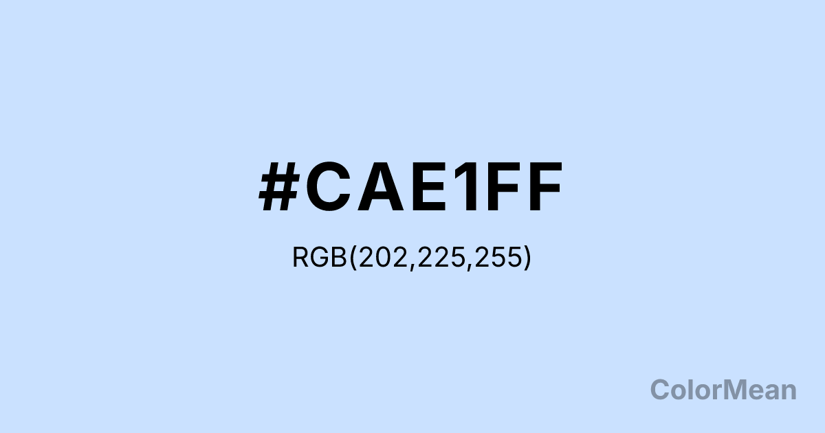 LightSteelBlue1 (#CAE1FF) RGB value is (202, 225, 255). The hex color red value is 202, green is 225, and blue is 255. Its HSL format shows a hue of 214°, saturation of 100 percent, and lightness of 90 percent. The CMYK process values are 21 percent, 12 percent, 0 percent, 0 percent.