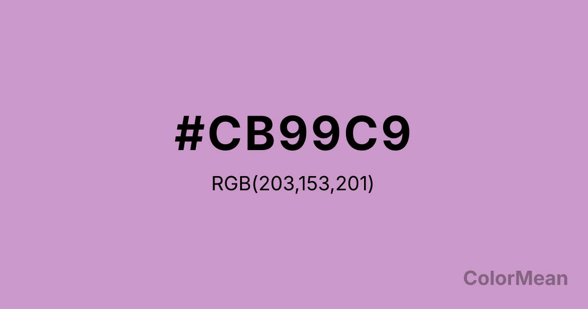 Pastel Violet (#CB99C9) RGB value is (203, 153, 201). The hex color red value is 203, green is 153, and blue is 201. Its HSL format shows a hue of 302°, saturation of 32 percent, and lightness of 70 percent. The CMYK process values are 0 percent, 25 percent, 1 percent, 20 percent.