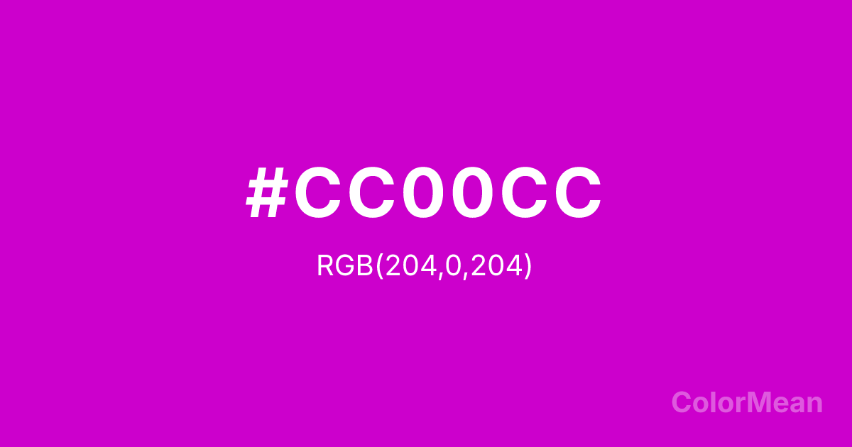 Deep Magenta (#CC00CC) RGB value is (204, 0, 204). The hex color red value is 204, green is 0, and blue is 204. Its HSL format shows a hue of 300°, saturation of 100 percent, and lightness of 40 percent. The CMYK process values are 0 percent, 100 percent, 0 percent, 20 percent.