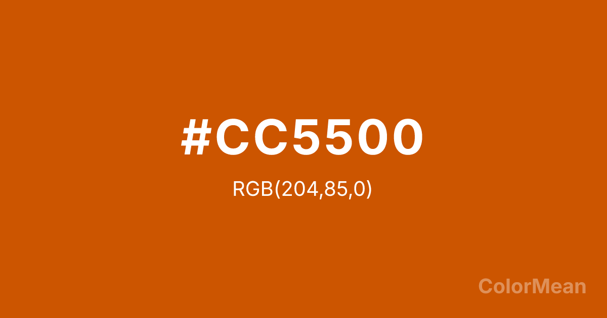 Burnt Orange (#CC5500) RGB value is (204, 85, 0). The hex color red value is 204, green is 85, and blue is 0. Its HSL format shows a hue of 25°, saturation of 100 percent, and lightness of 40 percent. The CMYK process values are 0 percent, 58 percent, 100 percent, 20 percent.