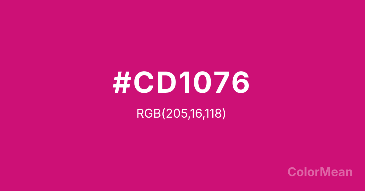 DeepPink3 (#CD1076) RGB value is (205, 16, 118). The hex color red value is 205, green is 16, and blue is 118. Its HSL format shows a hue of 328°, saturation of 86 percent, and lightness of 43 percent. The CMYK process values are 0 percent, 92 percent, 42 percent, 20 percent.