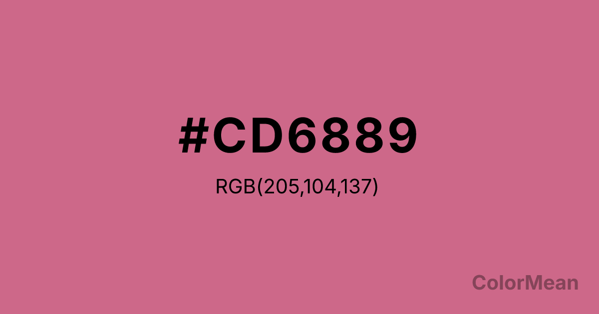 Pale Violet Red 3 (#CD6889) RGB value is (205, 104, 137). The hex color red value is 205, green is 104, and blue is 137. Its HSL format shows a hue of 340°, saturation of 50 percent, and lightness of 61 percent. The CMYK process values are 0 percent, 49 percent, 33 percent, 20 percent.