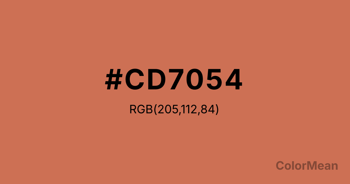 Salmon3 (#CD7054) RGB value is (205, 112, 84). The hex color red value is 205, green is 112, and blue is 84. Its HSL format shows a hue of 14°, saturation of 55 percent, and lightness of 57 percent. The CMYK process values are 0 percent, 45 percent, 59 percent, 20 percent.