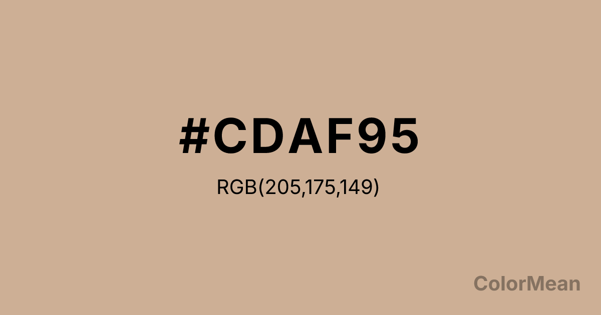 PeachPuff 3 (#CDAF95) RGB value is (205, 175, 149). The hex color red value is 205, green is 175, and blue is 149. Its HSL format shows a hue of 28°, saturation of 36 percent, and lightness of 69 percent. The CMYK process values are 0 percent, 15 percent, 27 percent, 20 percent.